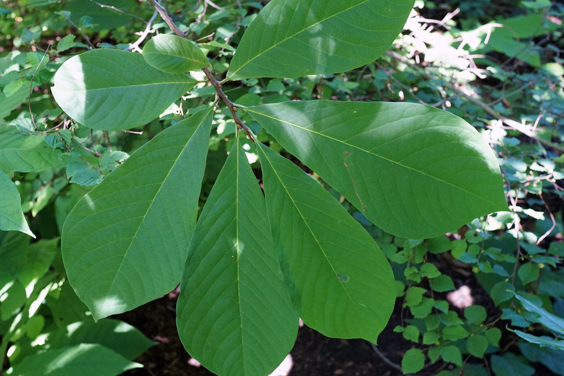 Pawpaw is a beloved native fruit tree which is common in understories of lowland areas. It produces large edible fruits with a yellow custard-like pulp. Many compare the taste to papaya, apple, banana, kiwi, and mango. It does not grow true to seed, so every pawpaw tastes differently. Pawpaw sends out many clonal stems and requires pollination from a nonclonal pawpaw to be properly fertilized. It is the northernmost species in the tropical plant family Annonaceae, or the soursop family. Additionally, it is an evolutionary anachronism – its large seeds evolved for extinct megafauna such as mastodons, mammoths, and giant ground sloths. The reason pawpaw has the extensive range it currently does is due to indigenous people enjoying its fruit and intentionally spreading it. Despite this fact, it is considered a threatened species in the wild in New York State due to development and habitat loss.